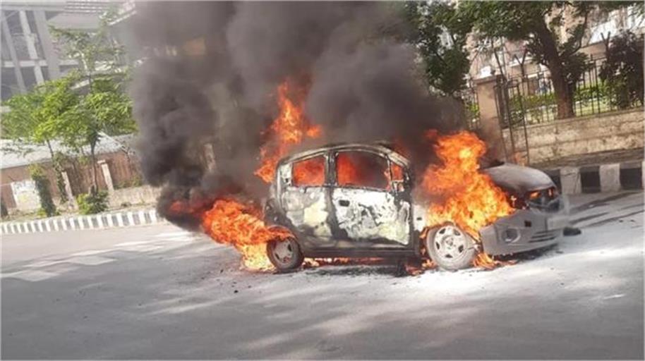 Quick Thinking Saves Life: Moving Car Catches Fire in Noida, Driver Jumps Out Just in Time